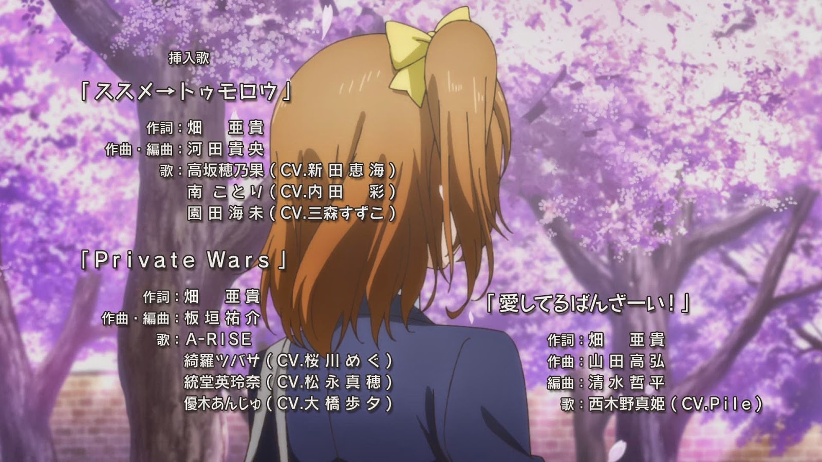 第一集的Ending「ススメ→トゥモロウ」,是跟開始做回呼應的,代表LoveLive動畫版的故事正式開始(但大家千萬不要學果果這樣衝出馬路避車跳舞);標題亦是代表這一個意思,亦有跟LoveLive School idol project當初開始時互相呼應,代表著另一個開始。A-RISE的「Private Wars」的洗腦性是很高的,大家可以去聽一期的原聲帶。